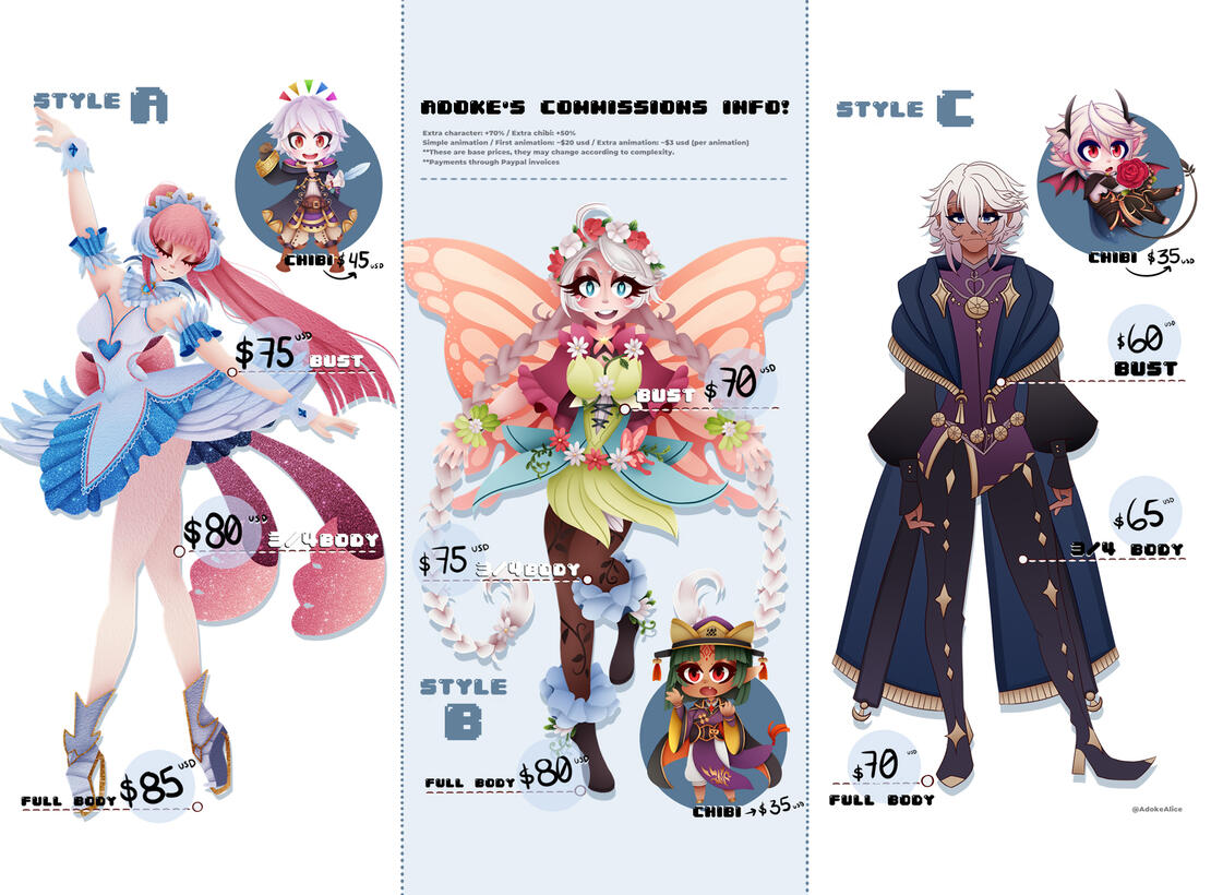 I reserve the right to post the commission in my own social media. (Unless you ask me not to).------------Communication:You can contact me via email, direct messages (DMs), or Discord, whichever method you feel most comfortable with. I will keep in touch throughout the process to ensure everything goes smoothly.------------Payment:*Payments will be made through PayPal invoices in USD.